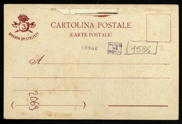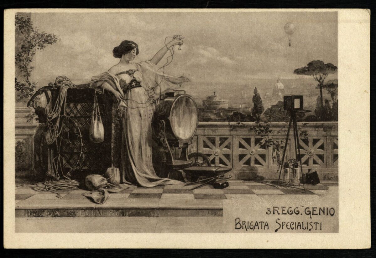 Una figura allegorica femminile è accanto ad un cesto per pallone aereostatico; sono inoltre presenti apparecchi telegrafici e fotografici. Sullo sfondo è raffigurata una veduta di Roma.