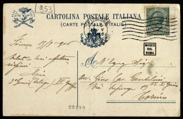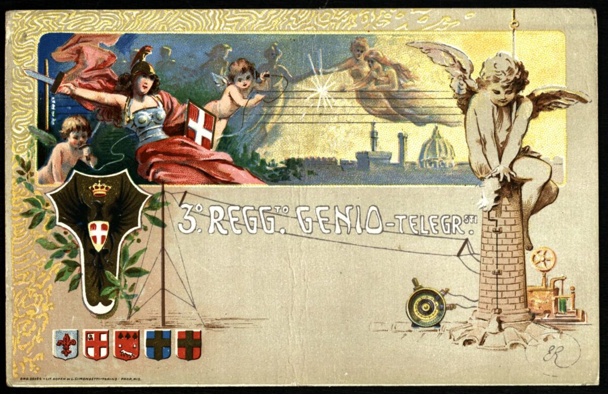 L’Italia-Minerva indossa elmo e corazza. Stringe inoltre nella mano destra un gladio e nella sinistra uno scudo con stemma sabaudo.