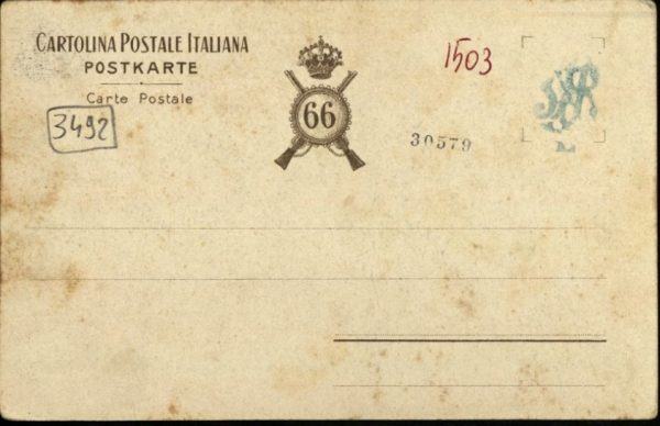 Sulla sinistra è ritratta l’Italia con corona d’alloro sul capo e con indosso una corazza. La mano destra di Italia alza al cielo lo Stellone. La cartolina celebra la battaglia di S. Lucia del Tione del 24 giugno 1866.