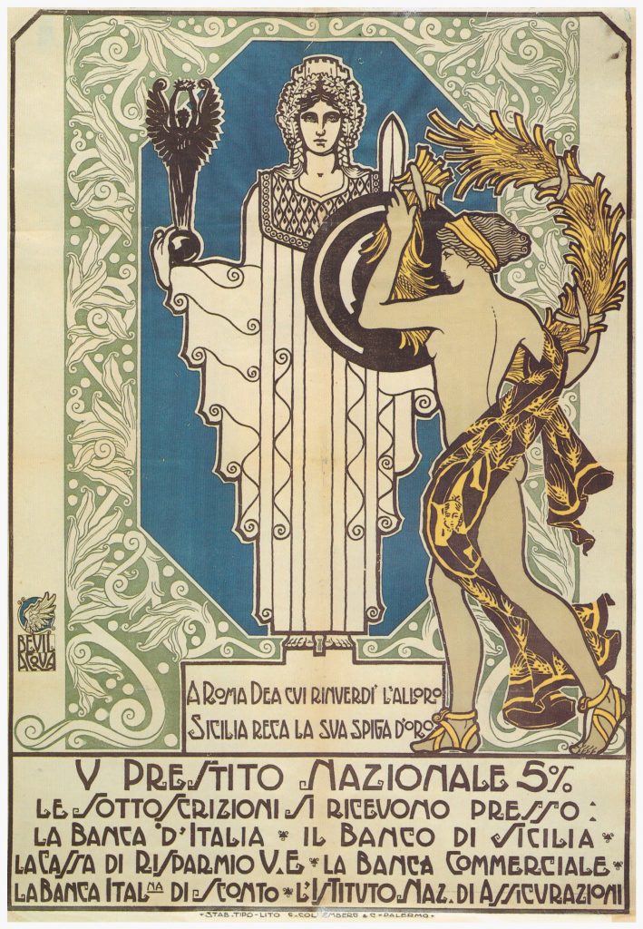 Roma è in veste di dea con in mano una statuetta della Vittoria alata; verso di lei avanza una ragazza seminuda, rappresentazione della Sicilia, che le offre una corona di spighe di grano. Sul manifesto si legge: “A Roma Dea cui rinverdì l’alloro Sicilia reca sua spiga d’oro. V Prestito Nazionale 5% . Le sottoscrizioni si ricevono presso la Banca d’Italia, il Banco di Sicilia, la Cassa di Risparmio V.E., la Banca Commerciale, la Banca Italiana di Sconto, l’Istituto Nazionale di Assicurazioni”.