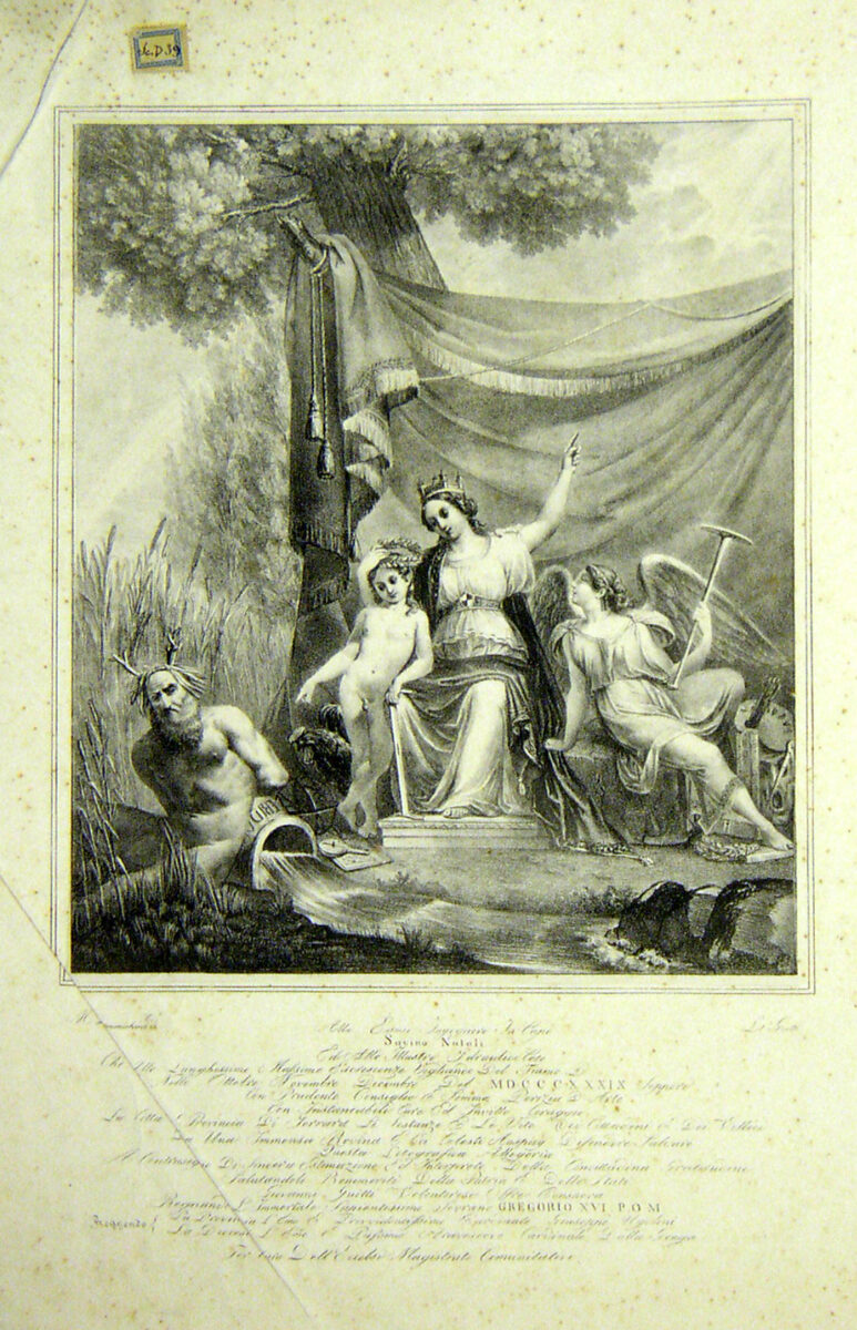 Al centro dell’incisione è rappresentata la figura femminile della città di Ferrara con in capo una corona turrita. In basso a sinistra è presente l’allegoria del fiume Eridano (antico nome del fiume Po).