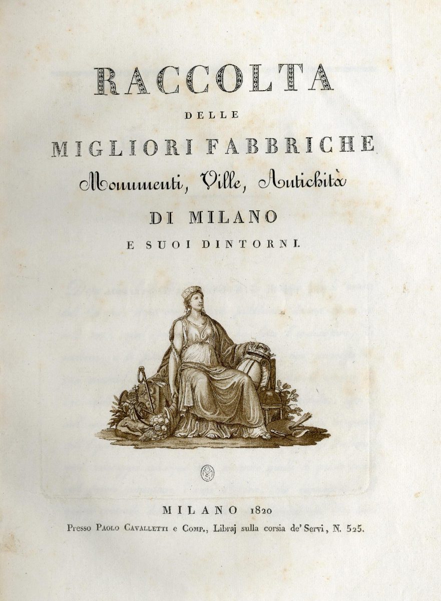 Sul frontespizio del volume Raccolta delle Migliori Fabbriche, Monumenti, Ville e Antichità di Milano e suoi dintorni è rappresentata l’allegoria della città di Milano: una donna turrita con accanto una cornucopia e vari simboli della città meneghina.