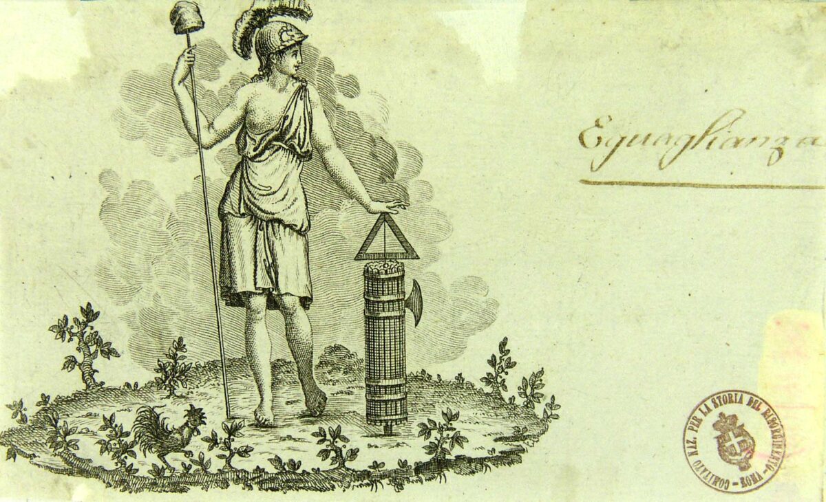 La Repubblica francese/Minerva indossa una tunica che le lascia un seno scoperto; porta inoltre l’elmo sul capo e stringe nella mano destra una picca, sulla cui sommità è posto un berretto frigio. La mano sinsitra è poggiata su un fascio littorio su cui è posto un archipéndolo. In basso a sinistra è rappresentato un galletto.