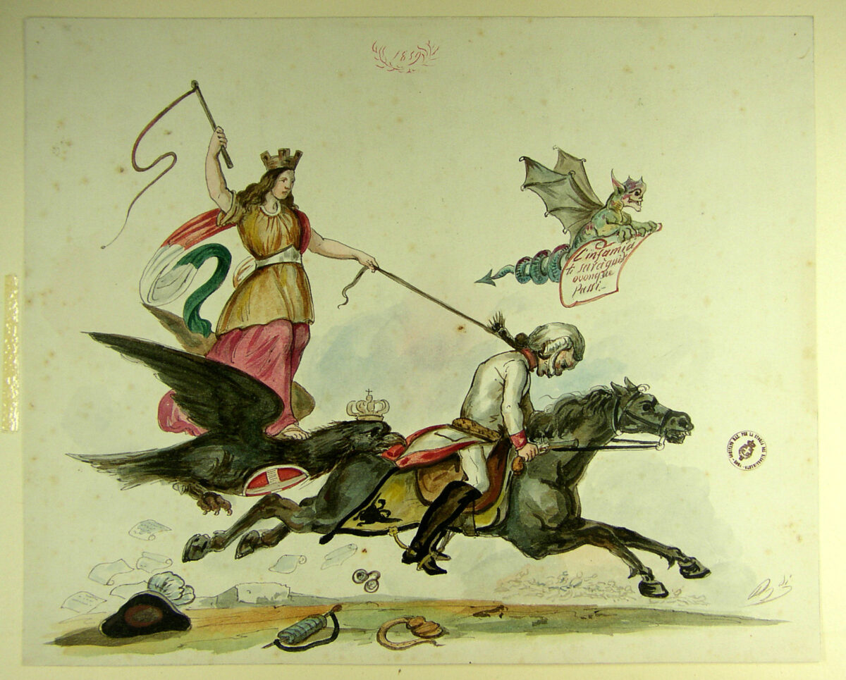 L’Italia turrita cavalca un’aquila con corona e scudo sabaudo sul petto, a rappresentare casa Savoia. L’Italia ha catturato l’Austria dell’Imperatore Francesco Giuseppe. Un draghetto stringe tra le zampe una pergamena con su scritto: “L’infamia ti seguirà ovunque passi'”. In alto è scritto l’anno 1859, a ricordare la seconda guerra d’indipendenza italiana.