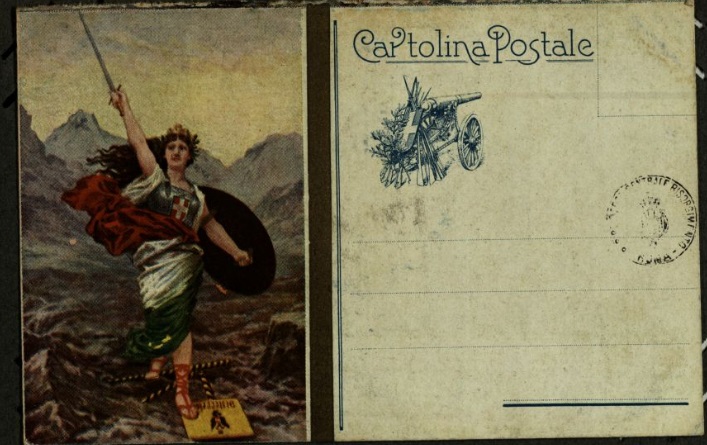 L’Italia turrita ha lunghi capelli neri al vento ed indossa un’armatura, paludata con il tricolore. Sta oltrepassando il confine austriaco alla conquista delle terre irredente. Brandisce, inoltre, nella mano destra una spada e nella sinistra uno scudo.