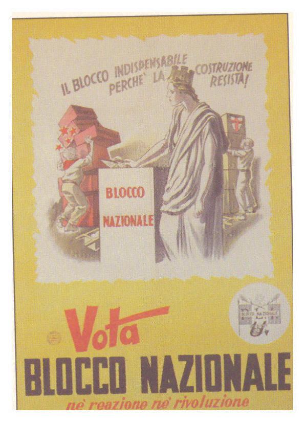 Manifesto politico del Blocco Nazionale per le elezioni politiche del 1948. L’Italia turrita è rappresentata con la cazzuola da muratore nella mano destra.