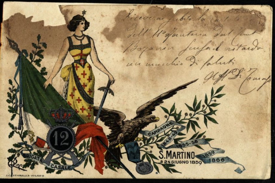 L’Italia è stellata ed ha con sé una spada e il tricolore. Accanto a lei è presente un’aquila. Vengono ricordate le campagne del 1848-1849, 1855-1856, 1859 1866 e la battaglia di S. Martino, 24 giugno 1859.