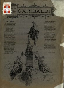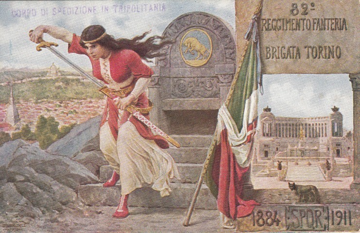 Una giovane donna dai capelli mori in abiti nordafricani sguaina la spada pronta a combattere in Tripolitania. La figura femminile è allegoria della città di Torino/Italia. Dietro di lei è ritratto il simbolo della città. Sullo sfondo è, inoltre, presente uno scorcio della città piemontese (a sinistra) e l’Altare della Patria (a destra).