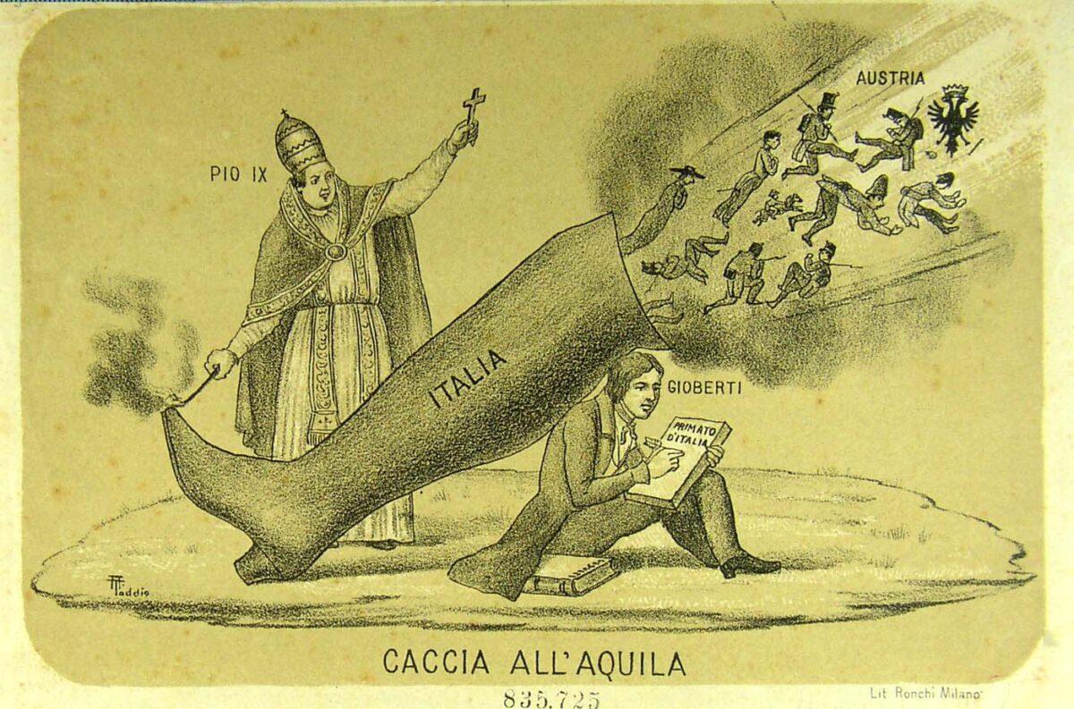 Pio IX accende la miccia dello stivale d’Italia, dal quale vengono sparati fuori militari austriaci. Sotto il cannone-stivale Gioberti scrive “Del primato morale e civile degl’Italiani”.