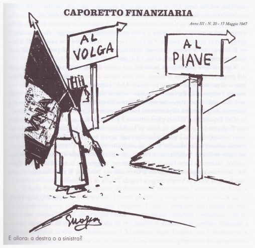 L’Italia turrita è a un bivio tra Volga e Piave, tra sinistra e destra. In calce: “E allora: a destra o a sinistra?”