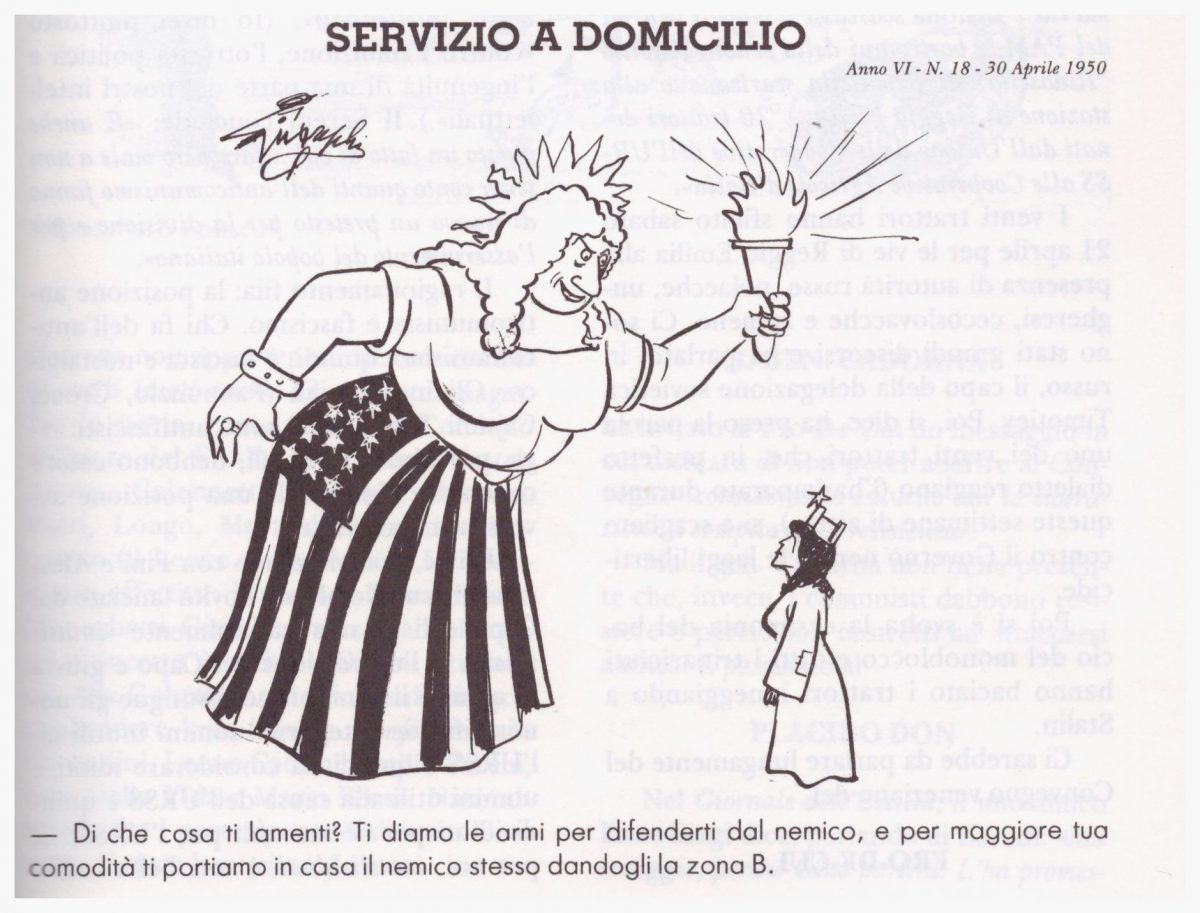 L’immagine corpulenta della Statua della Libertà simboleggia gli Stati Uniti d’America; questa giganteggia sulla figura dell’Italia turrita e stellata. La vignetta si riferisce all’arrivo, presso il porto di Napoli, di armi americane. In calce: “Di che cosa ti lamenti? ti diamo le armi per difenderti dal nemico, e per maggiore tua comodità ti portiamo in casa il nemico stesso dandogli la zona B”.