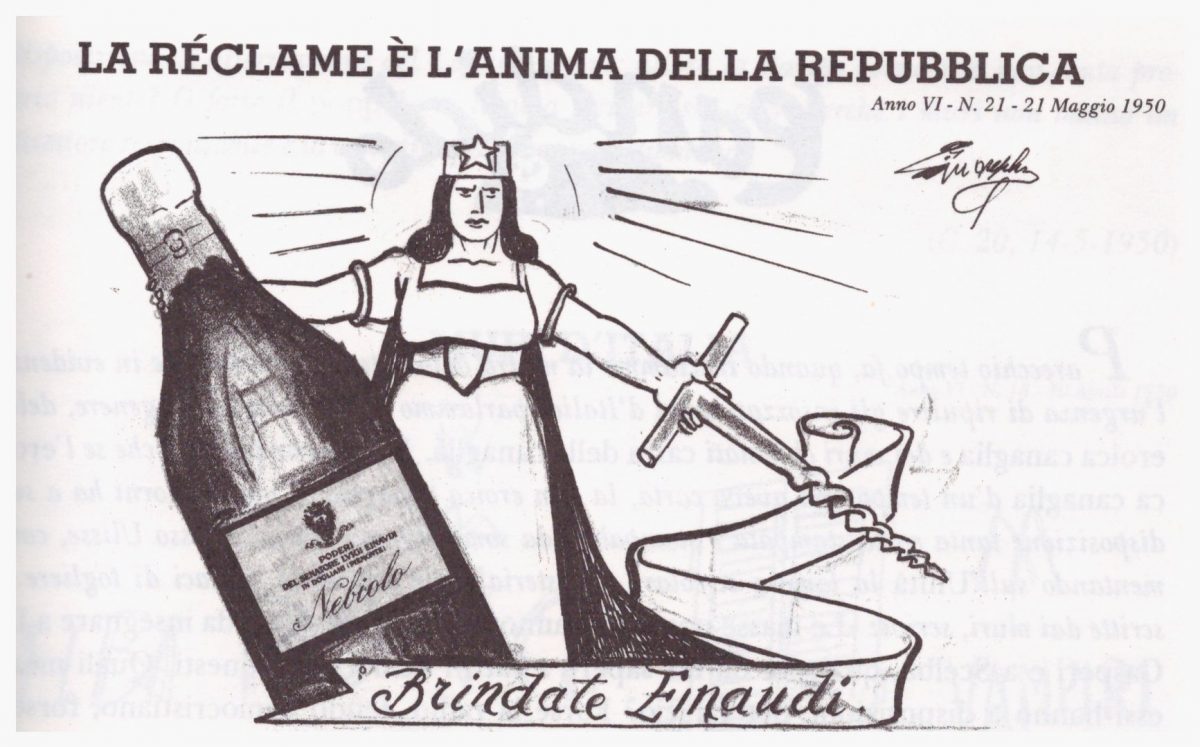 L’Italia turrita e stellata tiene nella mano destra un bottiglia di Nebiolo e nella sinistra un cavatappi. La bottiglia reca un’etichetta con su scritto: “Poderi del Senatore Luigi Einaudi in Dogliani (Piemonte)”. La vignetta è polemica nei confronti dell’attività del Presidente della Repubblica Luigi Einaudi, che, in visita al solone dell’automobile di Torino, si recò anche presso la casa editrice del figlio Giulio.