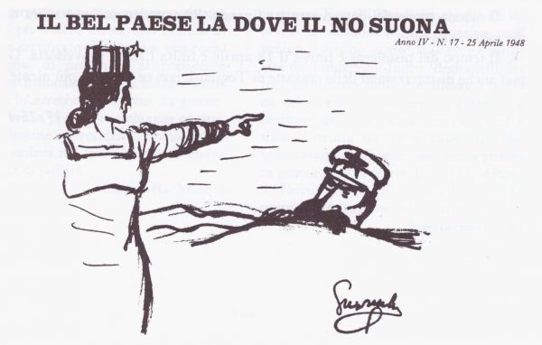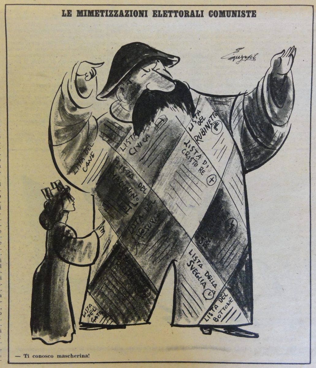 L’Italia turrita smaschera la grande figura di Stalin (ovvero il partito comunista), che aveva tentato di camuffare la propria presenza servendosi di liste civiche e apparentemente indipendenti. In calce: “Ti conosco mascherina!”.