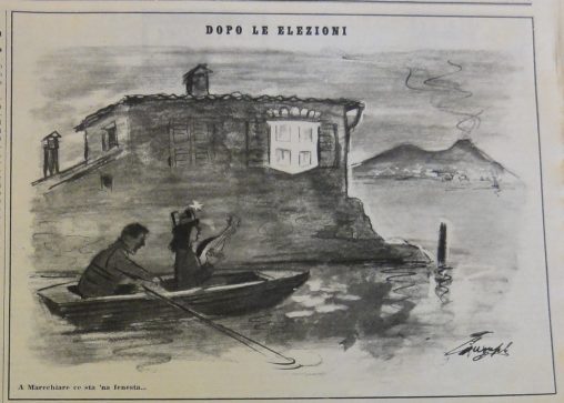 L’Italia turrita e stellata è in barca sul golfo di Napoli e suona il mandolino. Sullo sfondo il Vesuvio e una casa con un’imposta che richiama lo scudo…