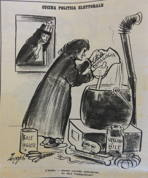 L’Italia turrita e stellata è preoccupata da ciò che bolle nel pentolone della politica italiana; un’anziana donna stata infatti preparando un minestrone poco invitante, i cui ingredienti sono:…