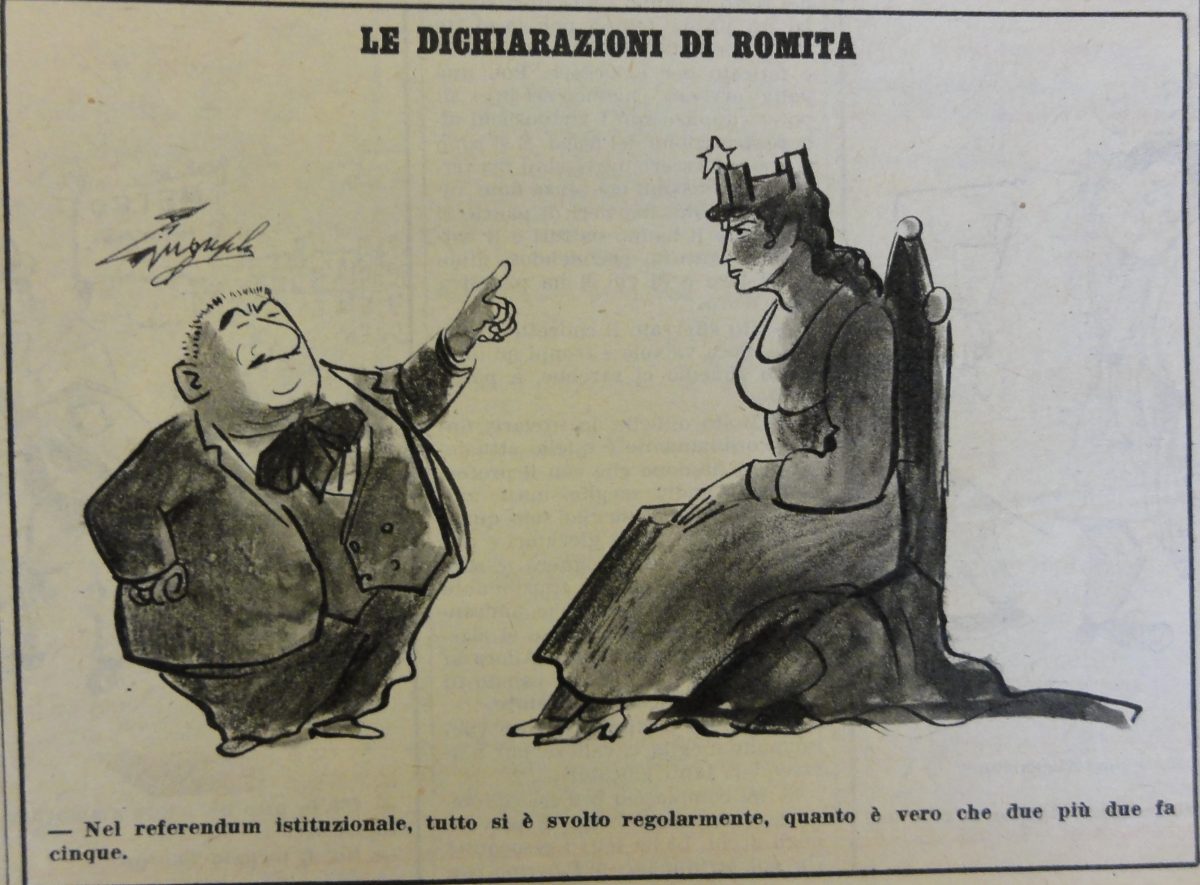 Giuseppe Romita difende i risultati del referendum istituzionale di fronte all’Italia turrita e stellata, la quale lo ascolta corrugata in viso. In calce: “-Nel referendum istituzionale, tutto si è svolto regolarmente, quanto è vero che due più due fa cinque”.