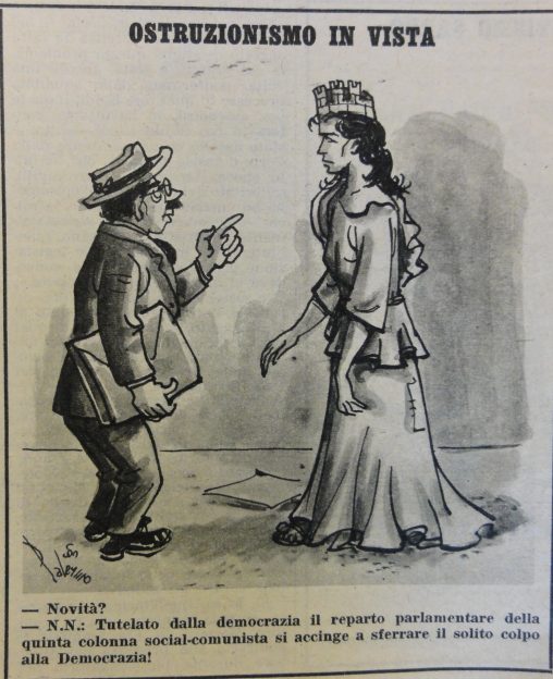 L’Italia turrita chiede informazioni sui lavori del Parlamento. In calce: “- Novità? – N.N.: Tutelato dalla democrazia il reparto parlamentare della quinta colonna social-comunista si accinge a sferrare…