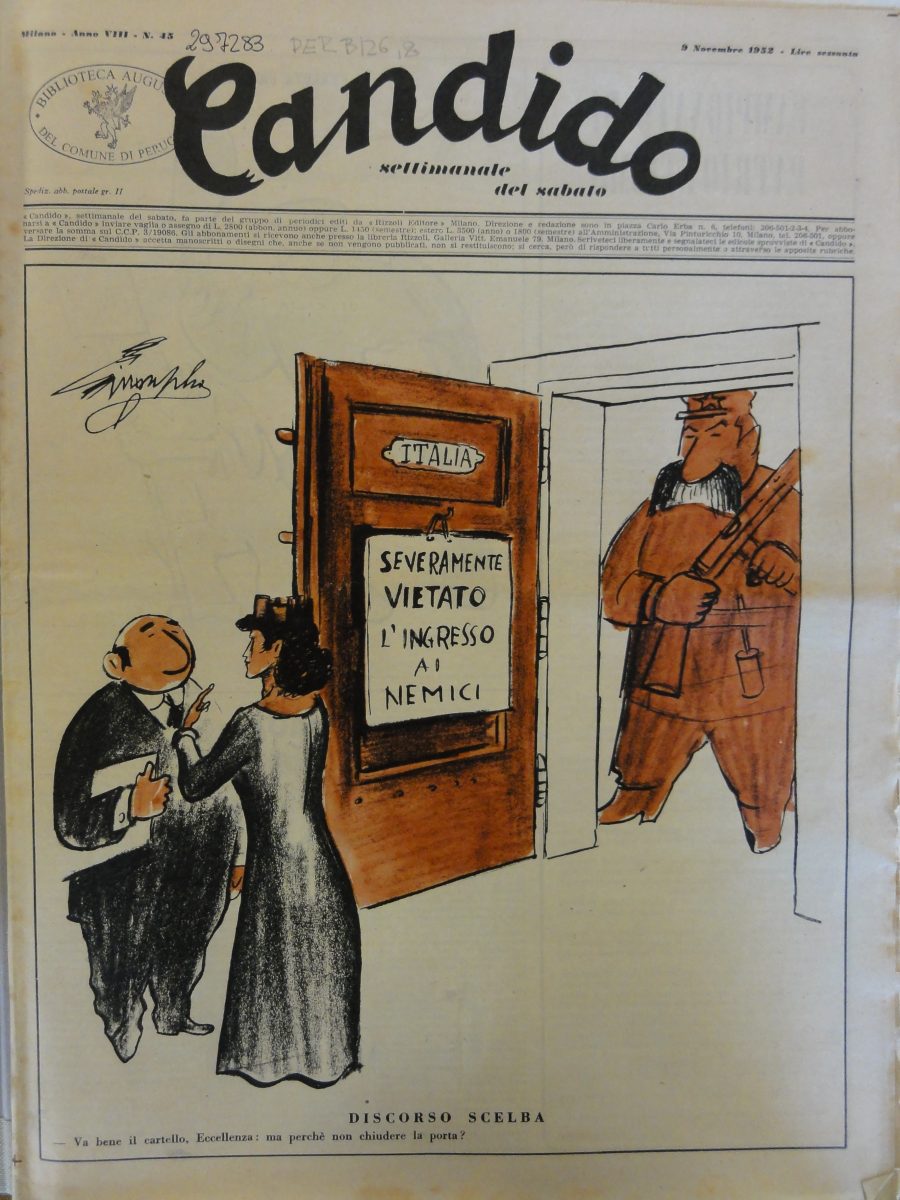L’Italia turrita si rivolge con determinazione a Mario Scelba , ministro dell’Interno. Sullo sfondo è raffigurata un porta sulla quale è scritto: “Italia – severamente vietato l’ingresso ai nemici”.  Stalin è pronto a varcare la soglia.  In calce: “- Va bene il cartello, Eccellenza: ma perché non chiudere la porta?”.