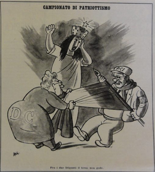 L’Italia turrita e stellata fa da arbitro al gioco di ruba-bandiera tra Democrazia cristiana e Partito comunista. In calce: “Fra i due litiganti il terzo non gode”.