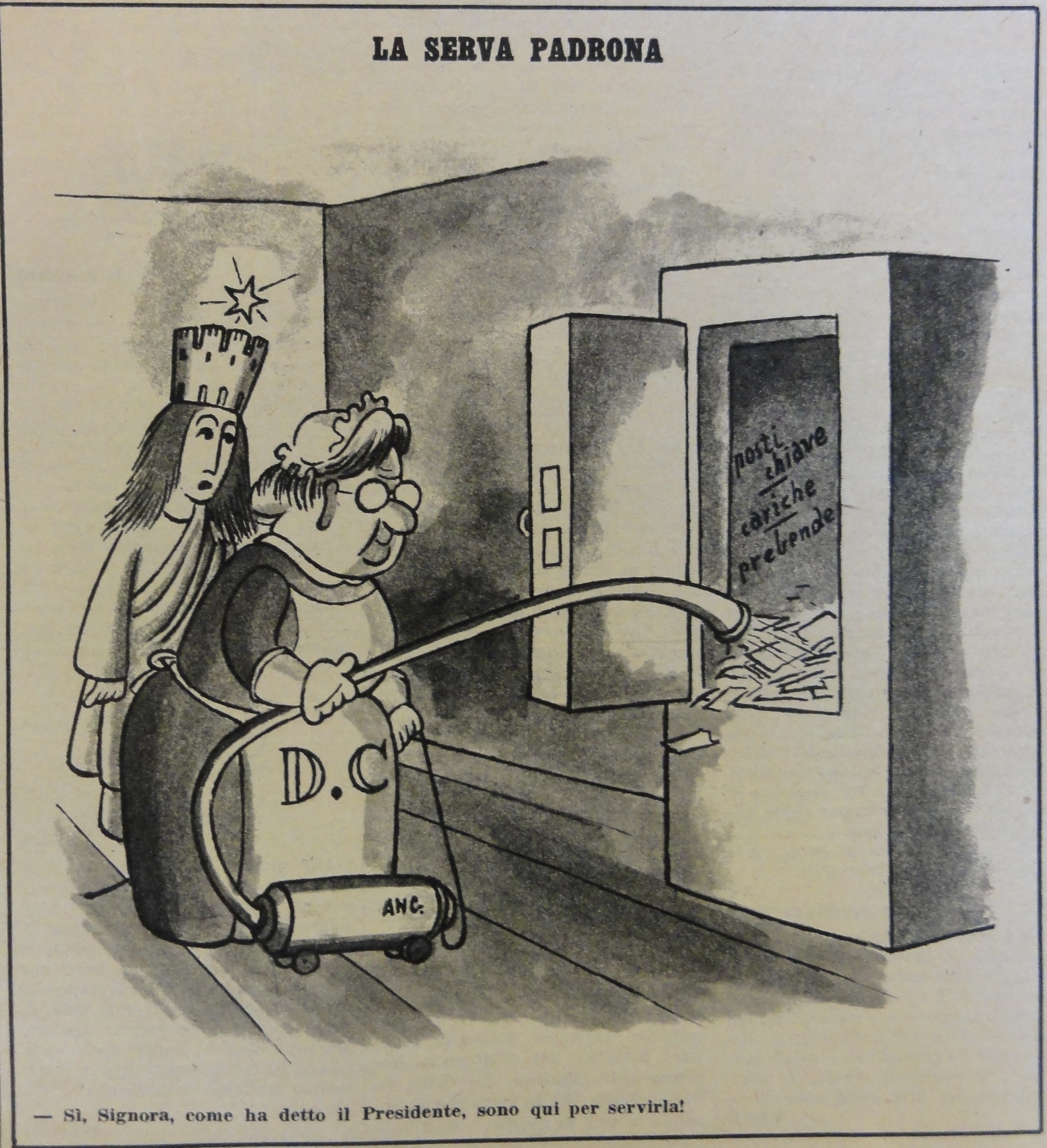 L’Italia turrita e stellata osserva perplessa una DC-collaboratrice domestica che con un’aspirapolvere ripulisce una cassaforte piena di “posti chiave, cariche, prebende”. In calce: “- Sì, Signora, come ha detto il Presidente, sono qui per servirla!”.