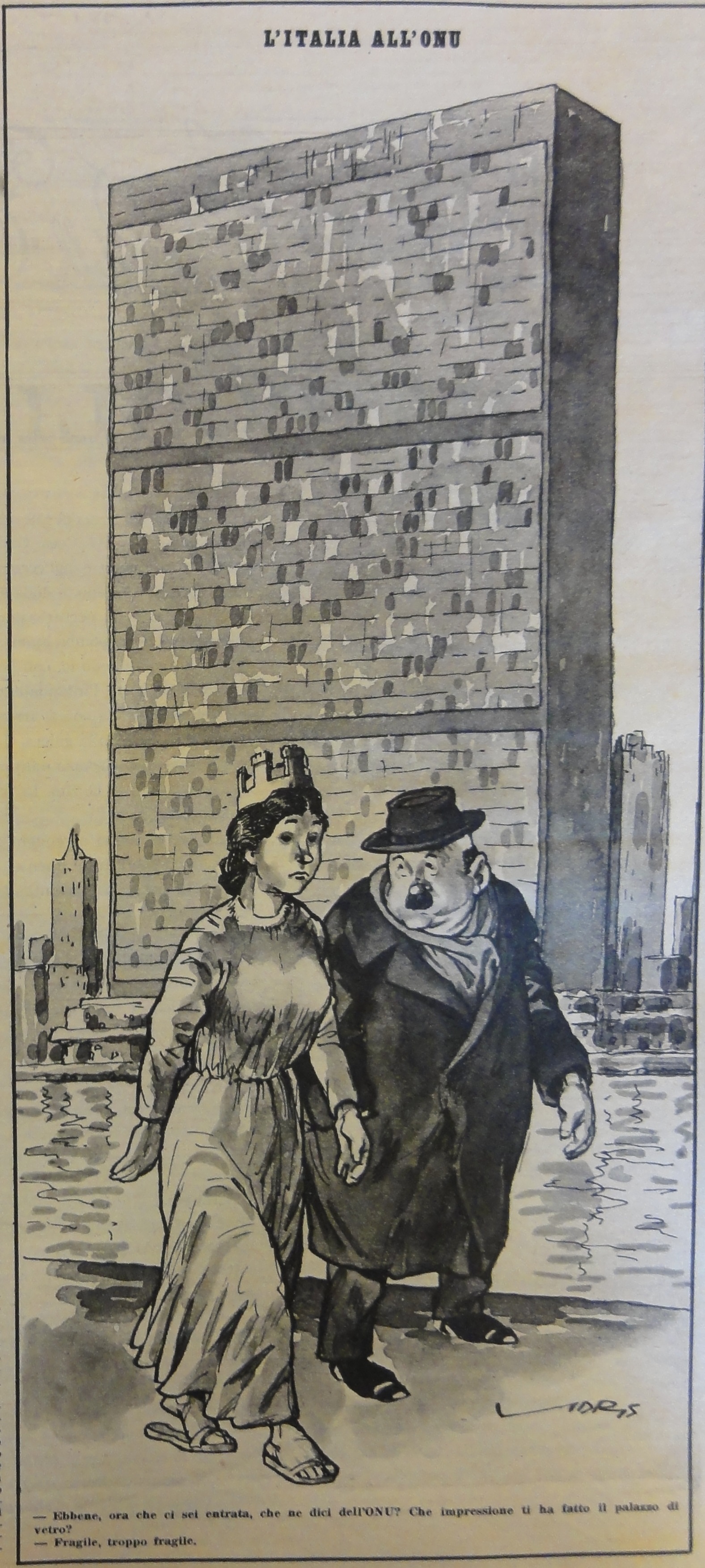 L’Italia turrita è stata ammessa all’ONU, ma l’entrata nell’Organizzazione non sembra averla né tranquillizzata né resa realmente felice. In calce: “- Ebbene, ora che ci sei entrata, che ne dici dell’ONU? Che impressione ti ha fatto il palazzo di vetro? – Fragile, troppo fragile”.