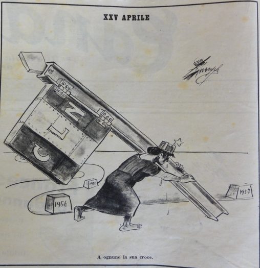 Per il venticinque di aprile l’Italia turrita e stellata porta sulle spalle, a mo’ di croce, un pesante tricolore in ferro e acciaio, su cui campeggia la scritta…