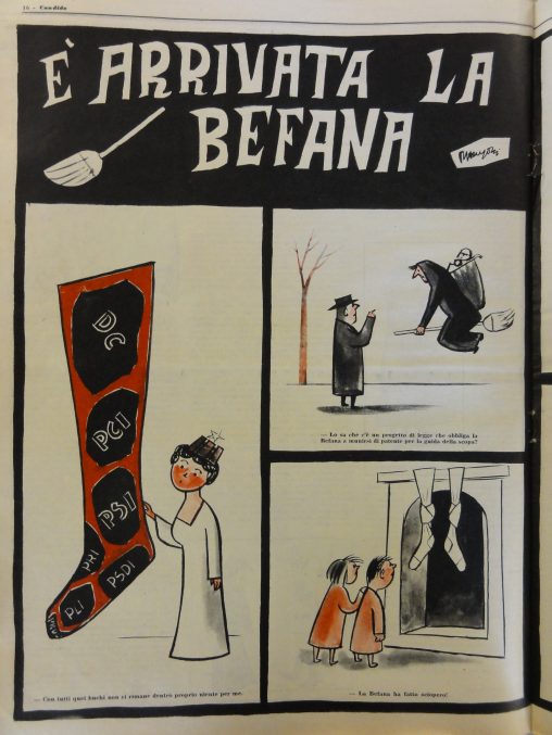 Nella vignetta di sinistra, l’Italia turrita e stellata prepara la calza che dovrebbe accogliere i doni delle Befana. La calza è però tutta bucata; i buchi sono rappresentati…