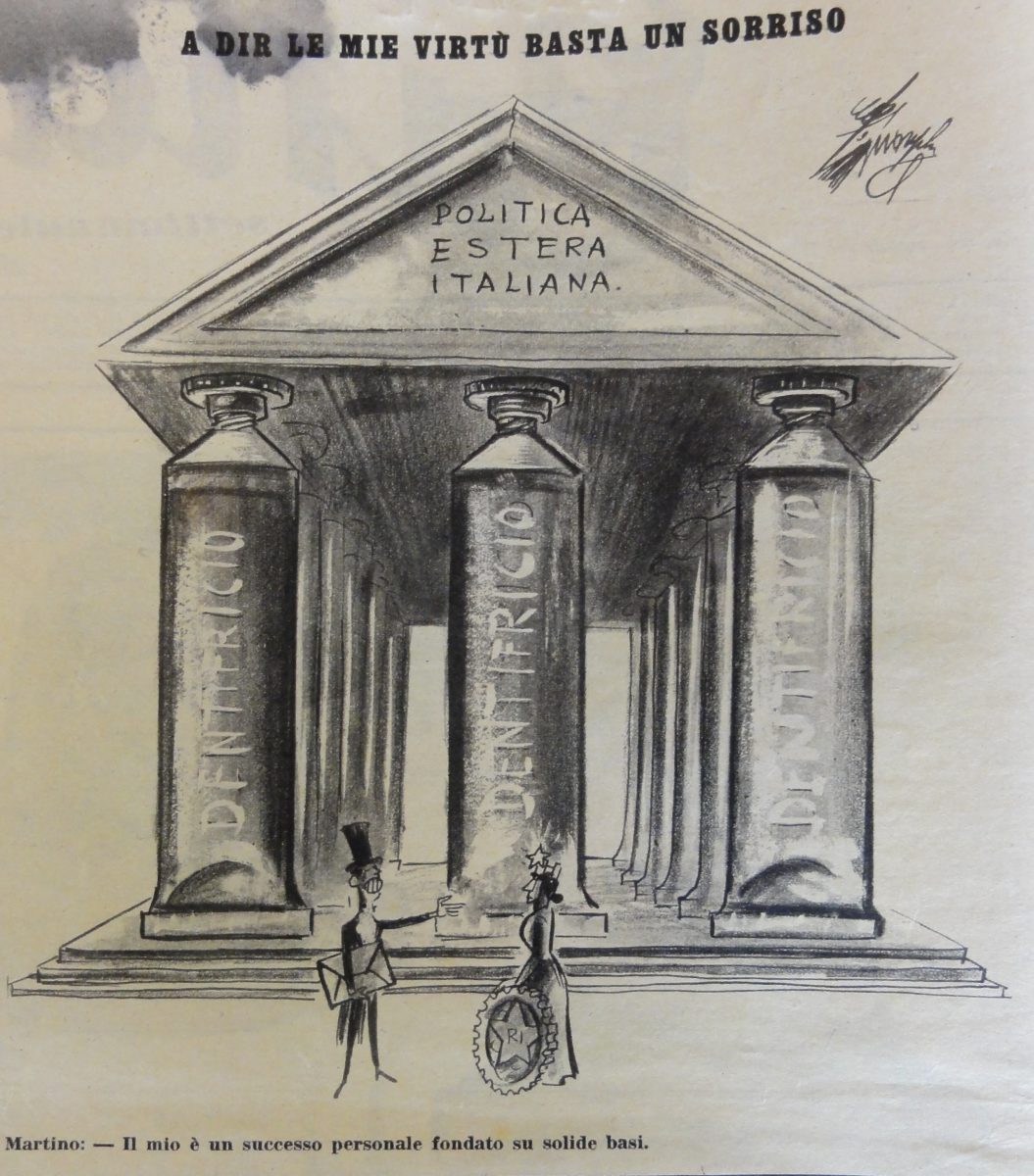 L’Italia turrita e stellata è di fronte al Ministro degli esteri, Gaetano Martino. In calce: “Martino: Il mio è un successo personale fondato su solide basi”.