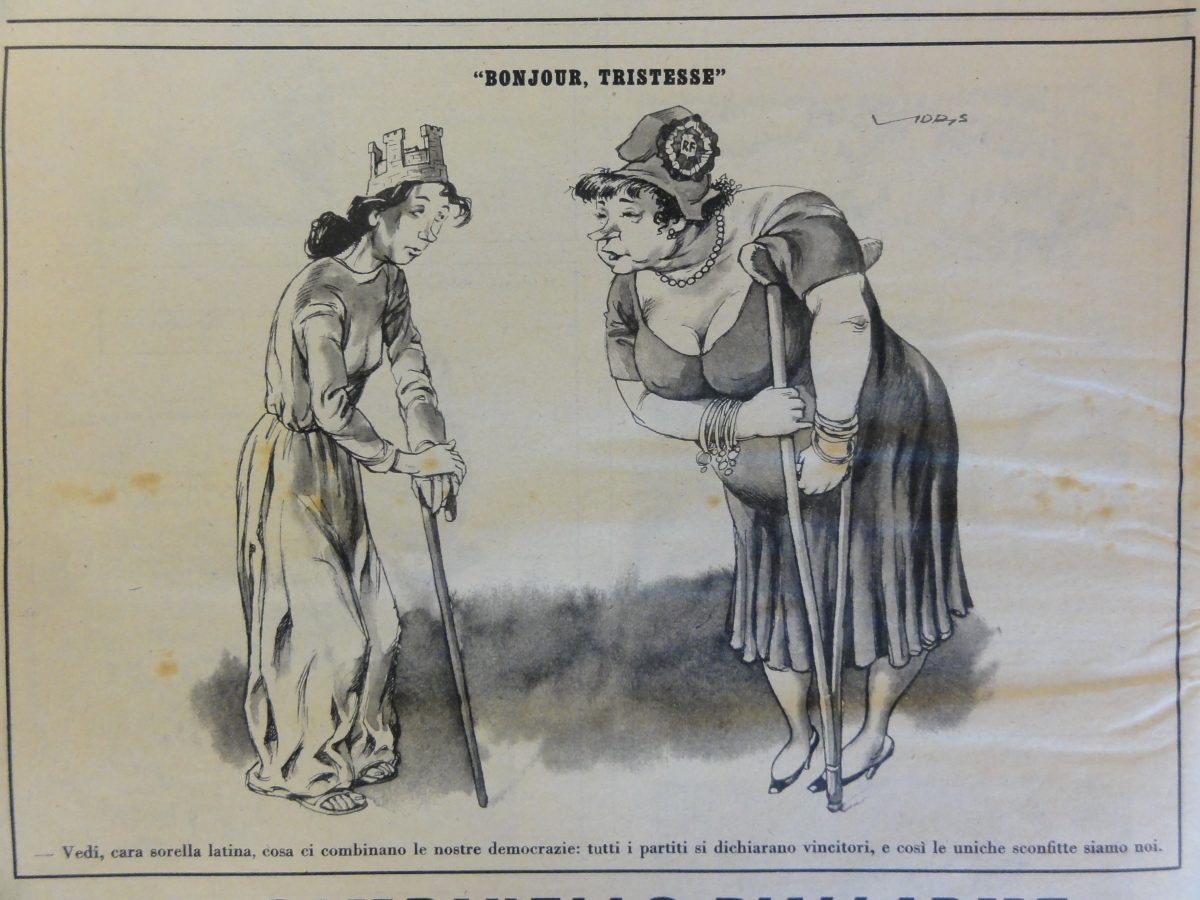 Italia e Francia si sorreggono in piedi grazie a delle stampelle. Sono entrambe malconce per colpa della democrazia e dei partiti. In calce: “Vedi, cara sorella latina, cosa ci combinano le nostre democrazie: tutti i partiti si dichiarano vincitori, e così le uniche sconfitte siamo noi”.