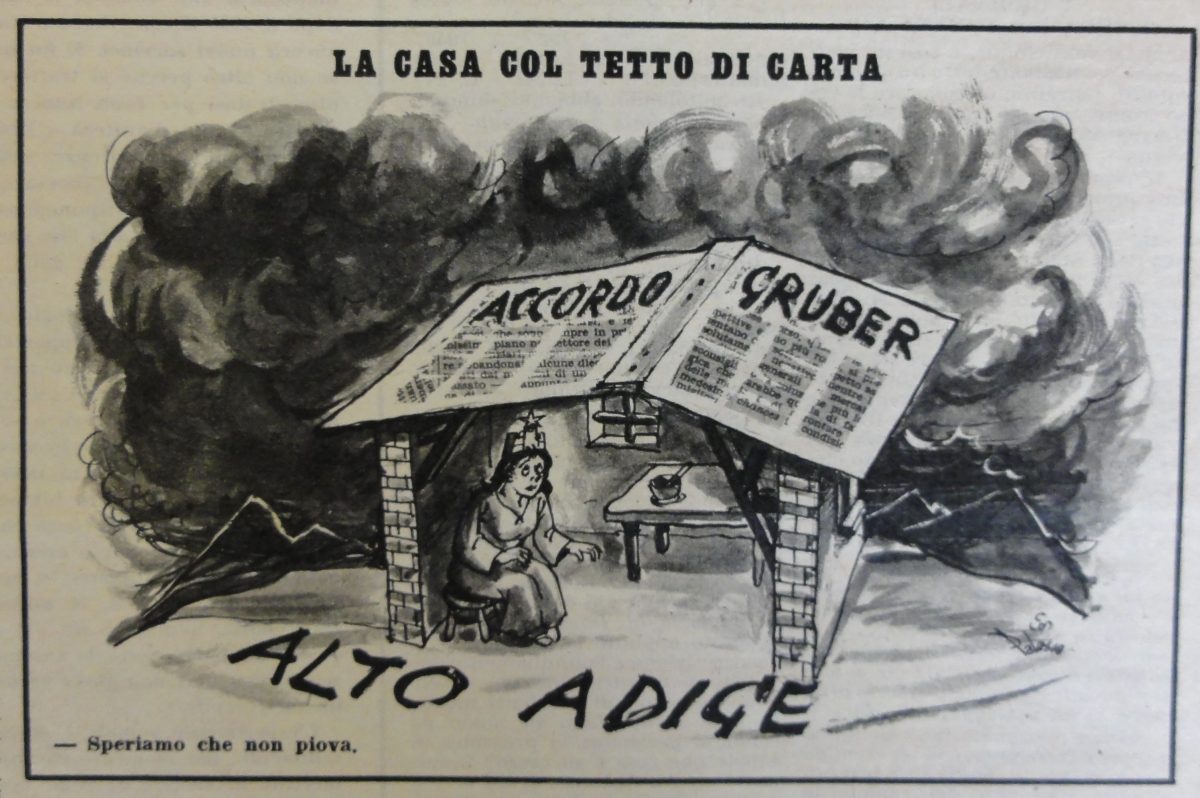 L’Italia turrita e stellata è in Trentino Alto Adige in una casa dal tetto poco solido, che sembra non possa resistere all’imminente bufera. Il tetto rappresenta l’accordo De Gasperi-Gruber che definiva la tutela della minoranza linguistica tedesca in Alto Adige. In calce: ” – Speriamo che non piova”.