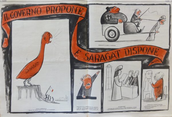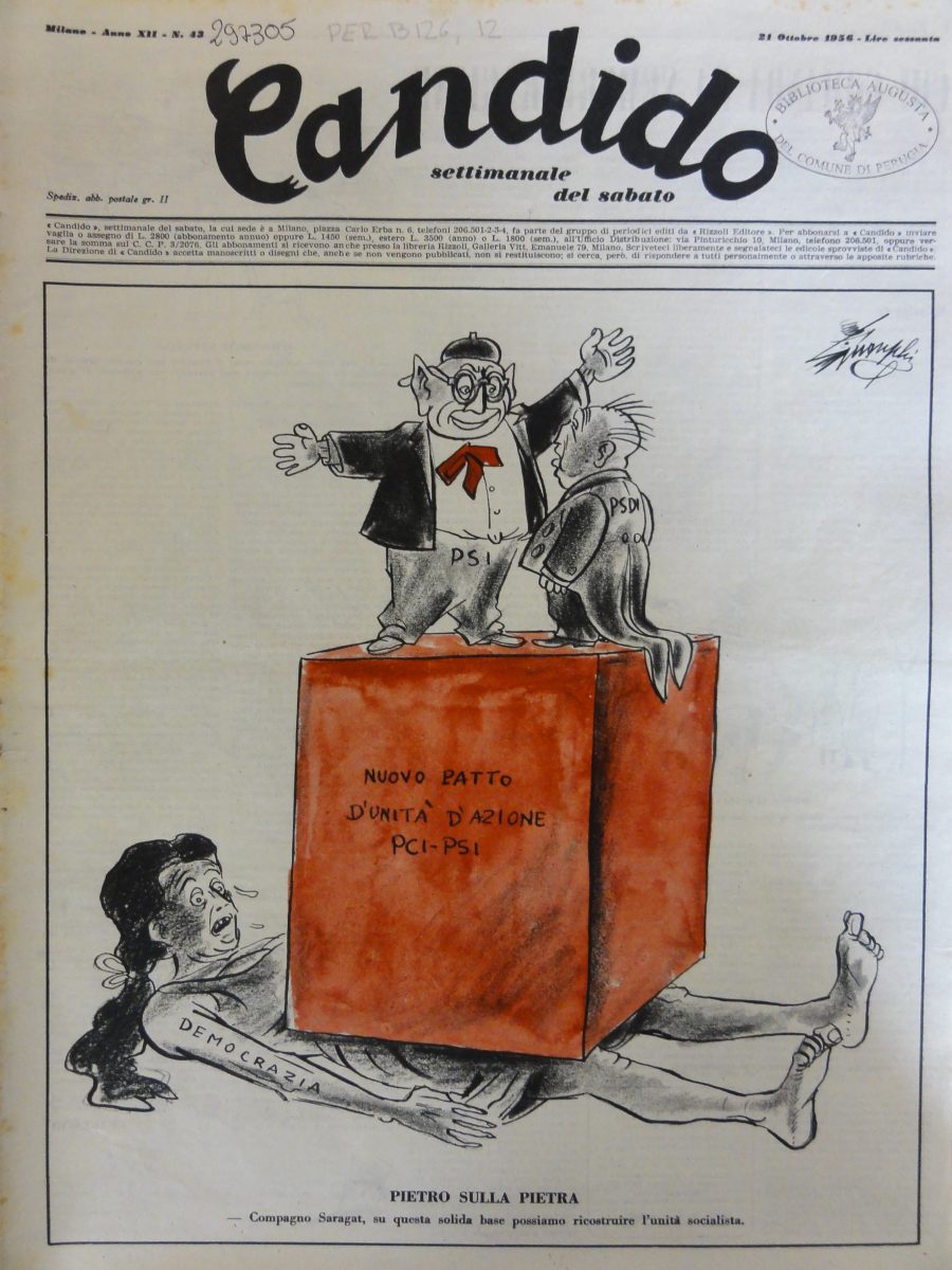L’immagine femminile della democrazia è schiacciata da un grande masso, che rappresenta “il nuovo patto d’unità d’azione tra PCI e PSI”. Sulla cima del grande blocco di pietra Pietro Nenni accoglie a braccia aperte Giuseppe Saragat. In calce: “- Compagno Saragat, su questa solida base possiamo ricostruire l’unità socialista”.