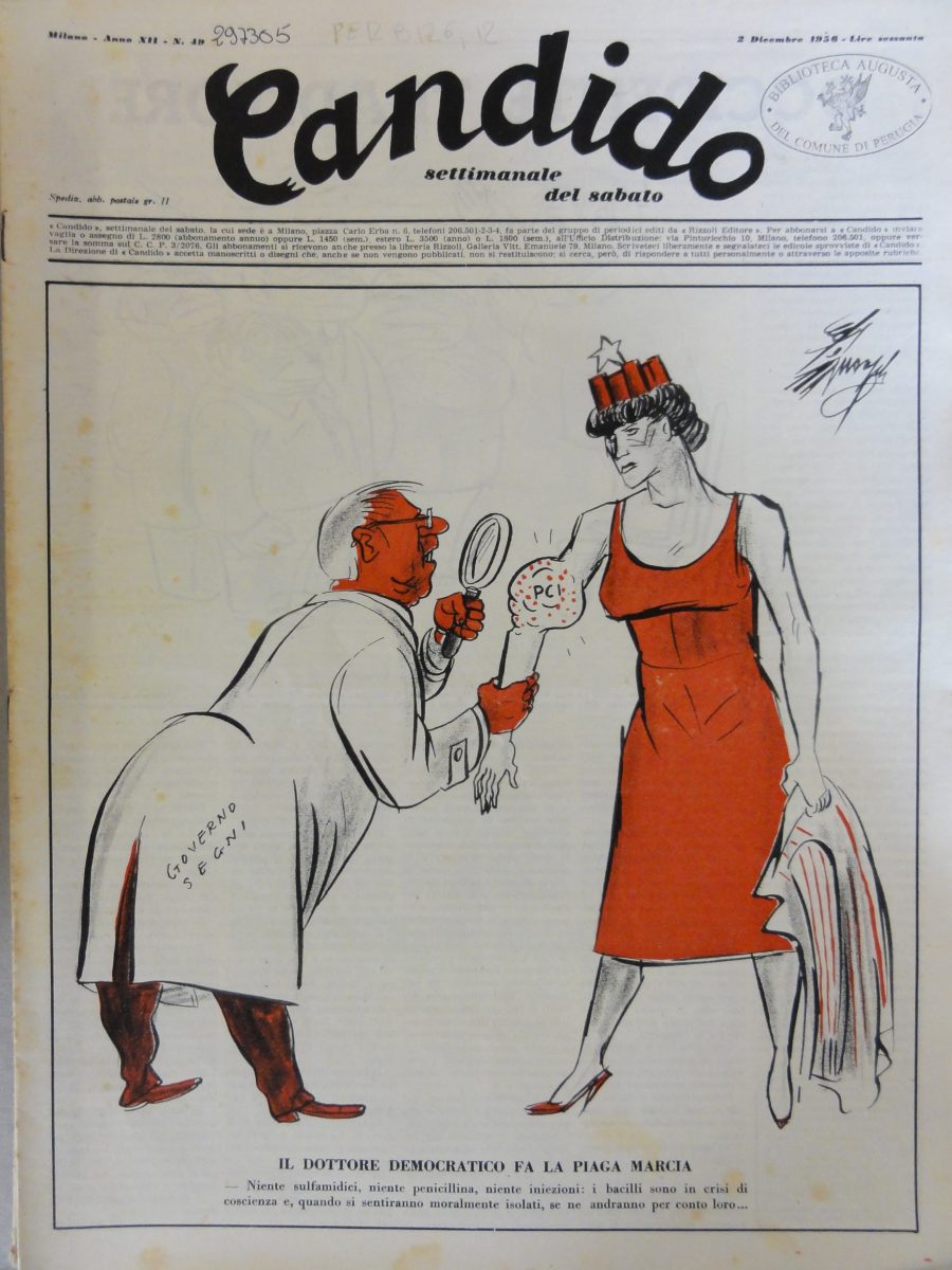 L’Italia turrita ha una vistosa pustola ‘comunista’ al braccio. Il dottore/”governo Segni” decide di non intervenire con nessuna cura, perché l’infezione passerà velocemente, essendo isolata. In calce: “- Niente sulfamidici, niente penicillina, niente iniezioni: i bacilli sono in crisi di coscienza e, quando si sentiranno moralmente isolati, se ne andranno per conto loro…”.