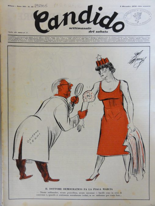 L’Italia turrita ha una vistosa pustola ‘comunista’ al braccio. Il dottore/”governo Segni” decide di non intervenire con nessuna cura, perché l’infezione passerà velocemente, essendo isolata. In calce: “-…