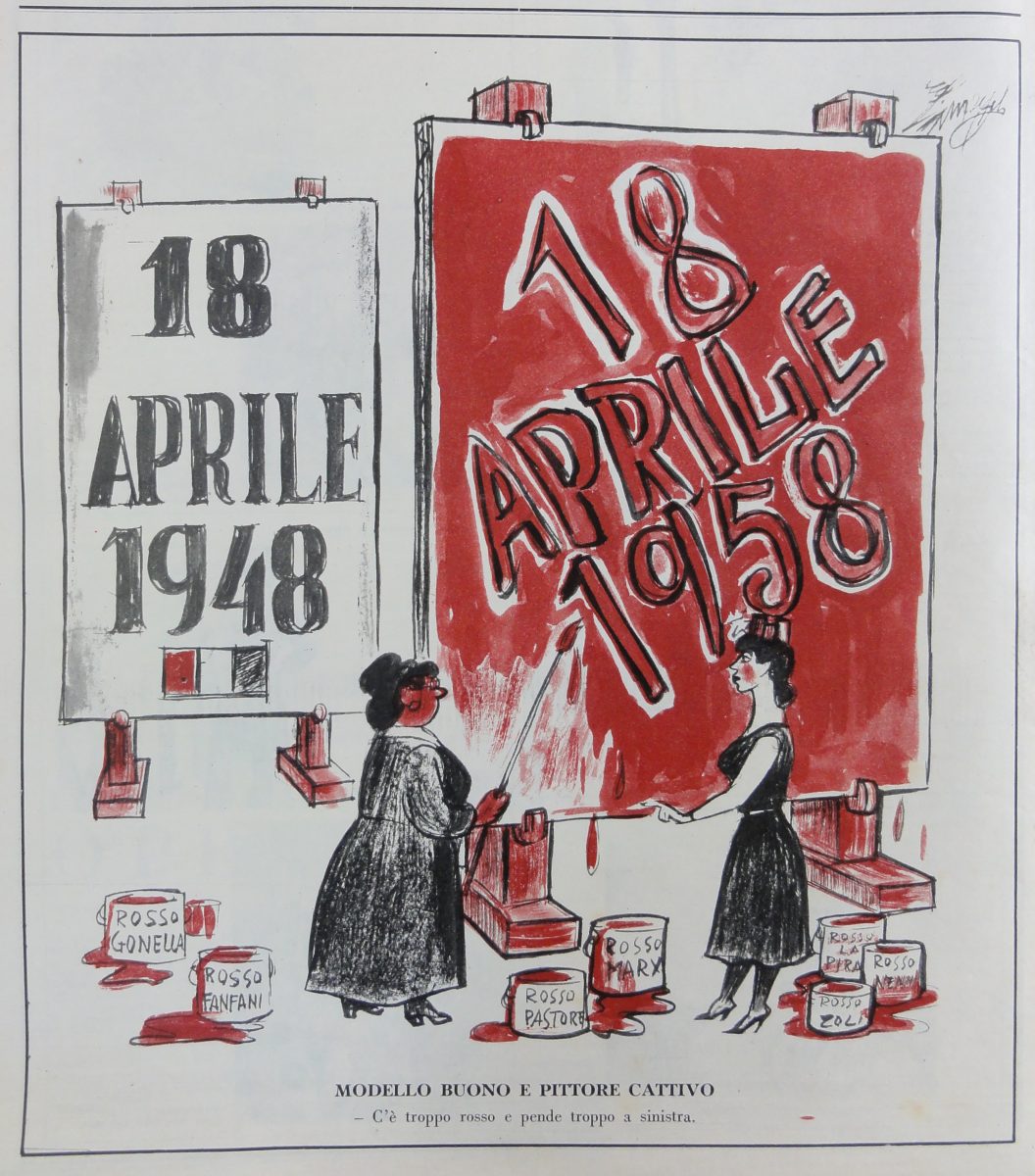 L’Italia turrita e stellata si dedica alla pittura e rappresenta il Paese a dieci anni dalle prime elezioni politiche del 18 aprile 1948. Ora il colore dominate è il rosso, in tutte le sue sfumature: “rosso Fanfani”, “rosso Gonella”, “rosso Pastore”…. In calce: ” C’è troppo rosso e pende troppo a sinistra”.