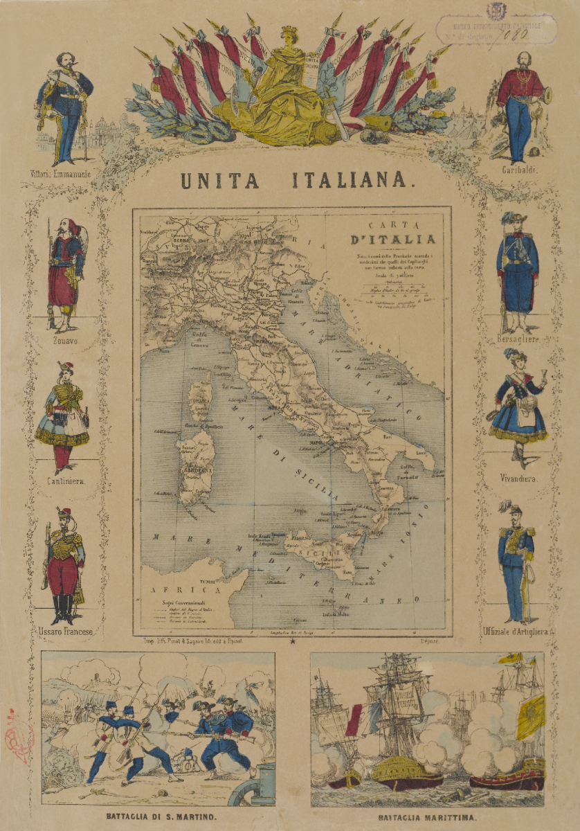 In alto è rappresentata l’Italia turrita, circondata dalle bandiere delle città di Genova, Napoli, Torino, Venezia, Roma, Milano, Ancona, Firenze, Cagliari e Palermo. Accanto all’Italia sono anche raffigurati Vittorio Emanuele II e Garibaldi.