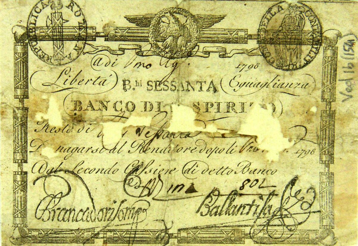 La carta moneta presenta in alto le scritte “Libertà” e “Uguaglianza”. Inoltre, sono raffigurati: il fascio littorio sormontato dal berretto frigio e circondato dalla scritta “Repubblica romana” (a sinistra); la figura femminile della Repubblica romana (a destra). Questa porta con sè un berretto frigio su una lancia e il fascio littorio.