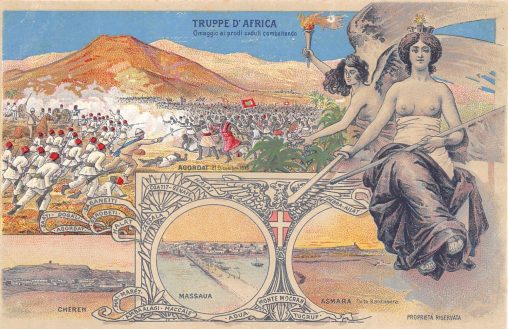 Sulla sinistra è ritratta l’Italia con corona d’alloro sul capo e con indosso una corazza. La mano destra di Italia alza al cielo lo Stellone. La cartolina celebra…