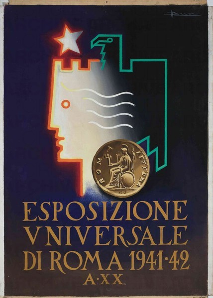 Nella bozza del manifesto per la mostra che celebra il decennale della rivoluzione fascista, i profili di Mussolini e dell’Italia turrita quasi si sovrappongono a formare un unico…