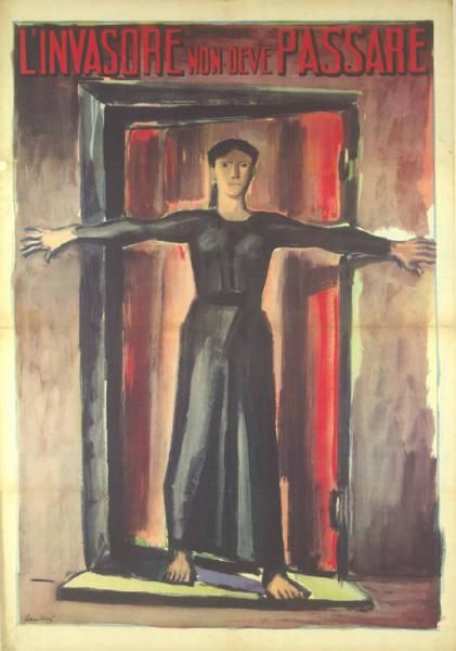 Manifesto politico del Blocco Nazionale (Partito Liberale Italiano, Uomo Qualunque) per le elezioni politiche del 1948. In primo piano, distesa a terra trafitta mortalmente da un pugnale (che…