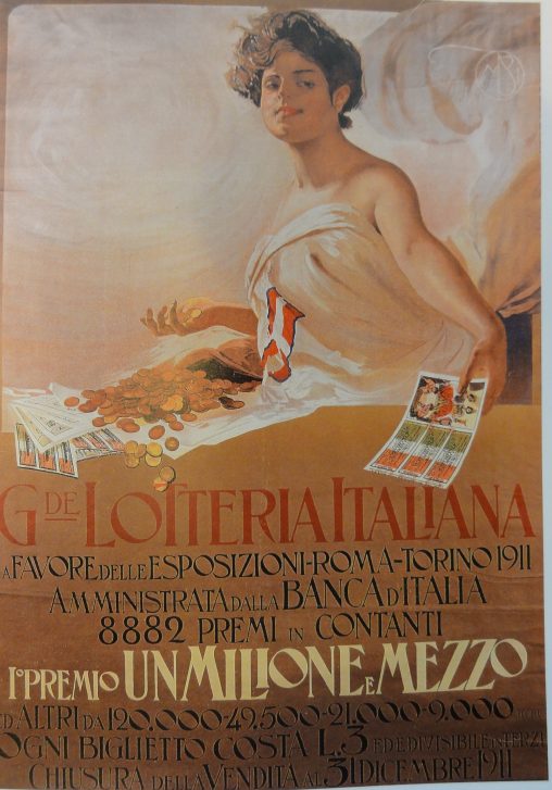Una figura femminile, che simboleggia l’Italia, stringe nella mano sinistra degli arbusti di melograno e nella mano destra delle sottoscrizioni al prestito nazionale. Manifesto della Banca Mutua Popolare…