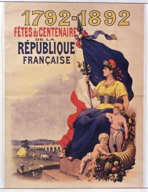 La Marianne è seduta e stringe in mano un ramoscello d’olivo e la bandiera francese. Accanto a lei due bambini, a rappresentare il popolo francese, e una cornucopia…