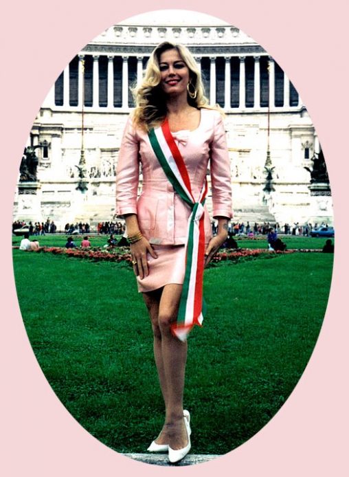 Moana Pozzi con fascia tricolore è di fronte all’Altare della Patria. L’immagine si riferisce alle elezioni amministrative del 1993, alle quali la Pozzi si candidò come sindaco di…