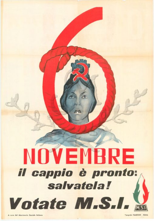 Manifesto di propaganda della Democrazia cristiana. L’italia turrita è immobilizzata ad un tronco dalla falce e martello comunista e, contemporaneamente, rischia di essere arsa viva dal fuoco del…