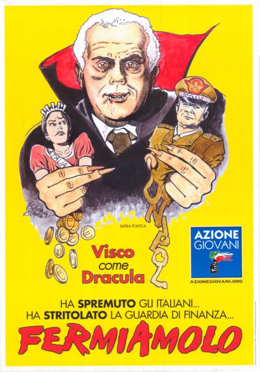 Manifesto politico satirico di Azione Giovani sul Vincenzo Visco, quando ricopriva la carica di vice ministro dell’economia con delega alle finanze. Visco stringe con forza l’Italia turrita e…
