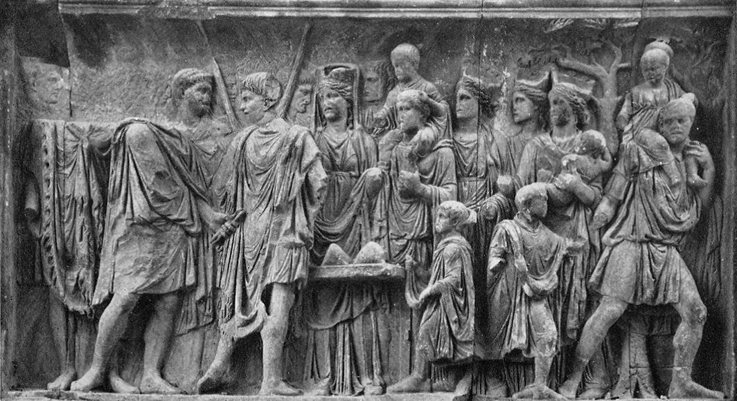 Nei monumenti dell’imperatore Traiano che commemorano l’Institutio Alimentaria, l’Italia è rappresentata con corona turrita, spesso accompagnata da bambini. In questa formella una donna con corona turrita e velo…