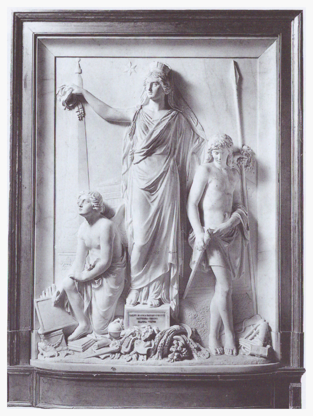 L’italia turrita e stellata è in compagnia del genio della Pittura (a sinistra), che disegna con uno stilo, e del genio della Scultura (a destra), fornito di scalpello….