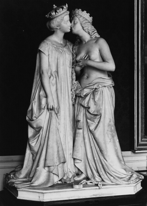 Una giovane Italia turrita, svestita dalla vita in su, sta per baciare la Francia, vestita di un lungo abito e coronata; con il braccio sinistro abbraccia Italia e…