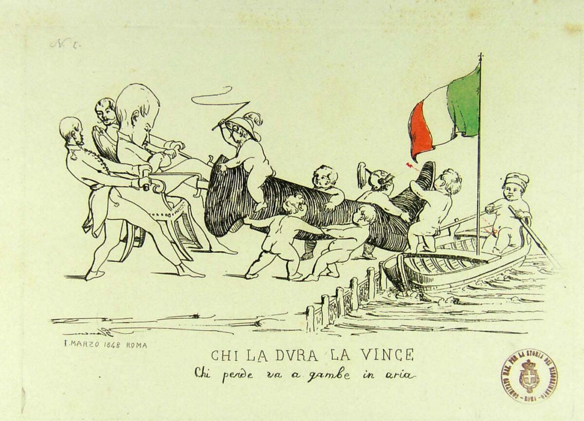 L’Italia è raffigurata come uno stivale, che le diverse potenze cercano di tirare dalla loro parte. Un putto è seduto sopra lo stivale e tenta di allontanare le diverse potenze con una frusta. Diversi altri putti cercano di portare lo stivale su una barca con bandiera italiana. In calce: “Chi la dura la vince. Chi perde va a gambe in aria”. In basso a sinistra: 1 marzo 1848 Roma. L’incisione fa parte del giornale umoristico «La lanterna magica».