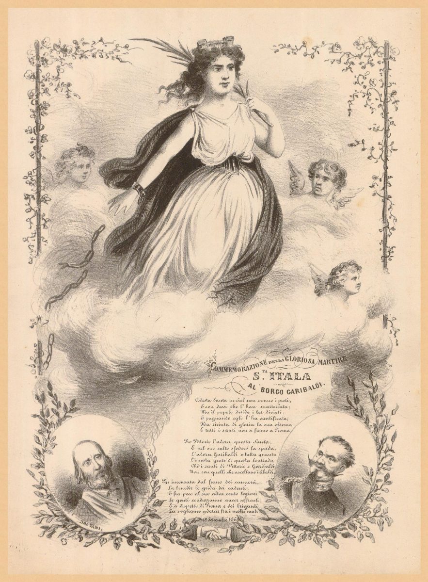 L’Italia turrita è libera dalle catene, perché unita.  In basso sono ritratti Giuseppe Garibaldi (a sinistra) e Vittorio Emanuele II (a destra).