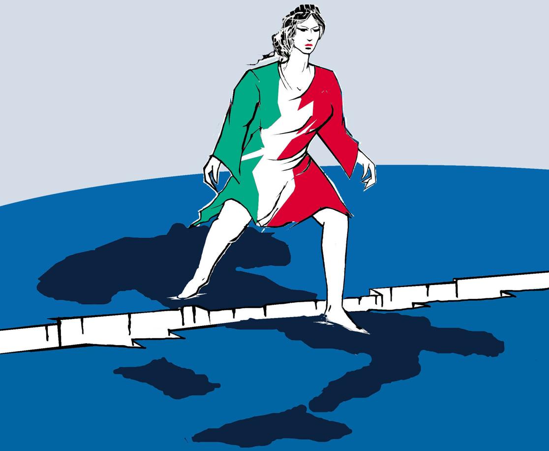 L’Italia turrita, vestita con i colori del tricolore, sta in piedi sopra una Penisola spaccata in due. Il riferimento è alla crisi sanitaria ed economica che ha colpito il Paese, causata dal Covid-19.